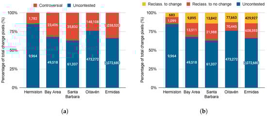 Focusing more on the consensus techniques, Table 6 shows the uncontested and controversial change pixels for each dataset and the subsequent reclassification of the controversial pixels. As explained in Section 2, the uncontested pixels were classified by all three detectors on the same class; for the controversial pixels, there was no consensus among the detectors, so they had to be reclassified. As shown in Table 6, the OR technique reclassified all of the controversial pixels as a change, while the MV technique, on average, reclassified more pixels as no change than change. Figure 14a shows the percentage of pixels of each type for each dataset with a higher percentage of uncontested pixels than controversial pixels, which implied that there was a consensus between the three detectors of 70.90% on average without the application of any additional technique. The remaining 29.10% were pixels with no consensus among the detectors that had to be reclassified. Two techniques were applied to perform the reclassification of the controversial pixels: OR fusion, which reclassified all of the controversial pixels as change, and the MV fusion shown in Figure 14b, which reclassified on average 56.93% of the controversial pixels as no change and the rest as change.