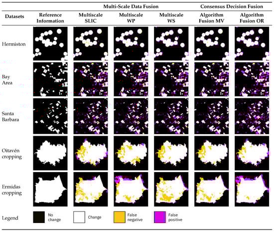 Table 5 presents the accuracy results for each step of the technique evaluated in terms of different metrics: CP, NCA, and OA, showing the multi-scale detection results using only the best option selected above, the ED fusion, and the results using consensus fusion by MV and OR. Since the MV technique reduces the number of FPs (higher NCA) at the cost of detecting fewer changes (a higher number of FNs and a lower CP), this technique obtains results where each detected change has a higher probability of being a real change. In contrast, the OR fusion technique has the opposite behaviour, as it detects a larger number of changes (reduces the number of FNs and increases CP) at the cost of an increase in the number of FPs (lower NCA). Therefore, the latter technique allows the generation of change maps for which the number of undetected changes is minimal. The best consensus method for the main objective of this paper is the OR fusion because it obtained the best CP results (marked in bold) with only small OA decreases.