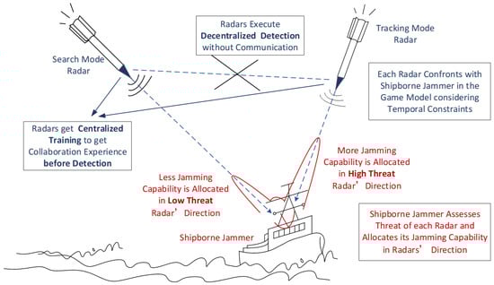 - In the game model, it is assumed the total jamming capability of the shipborne jammer is constant and limited and is allocated in each radar’s direction by solving the optimization problem with the restraints of the radar threat assessment result and its probability of successful detection. The radars work collaboratively through prior centralized training and obtain a good performance by decentralized execution without communication.