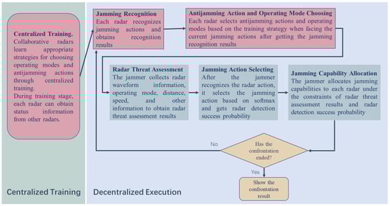 To improve the efficiency of missile-borne radar collaborative detection and antijamming, it is necessary to optimize the collaborative mode with the algorithm. The ideal condition of radar coordination is that real-time communication can be carried out in the process of detection and antijamming. In this way, real-time action adjustments can be made in the process of detection and antijamming in flight to improve the probability of radar successful detection. However, it is often difficult for the missile-borne radar to communicate during the implementation of detection and antijamming. Therefore, the absence of communication during collaborative antijamming can be regarded as the working condition of multi-radar cooperation. Based on the characteristics of the MADDPG algorithm for CTDE, the optimal strategy can be obtained through centralized training, and the optimal action can be given by using only local information in the application. The flowchart of the proposed algorithm is shown in Figure 2. The left part shows the radars performing centralized training to learn appropriate strategies for choosing operating modes and antijamming actions. They can obtain status information on other radars during the training stage. The right part shows the decentralized execution stage. The radars perform the jamming recognition and then choose antijamming actions and operating modes. Then, it comes to the jammer round. It collects radar information and assesses the radar’s threat to the jammer. Then, it selects jamming actions, obtains the radar’s detection success probability and allocates jamming capabilities to each radar. We should judge if the confrontation has come to an end. If so, the experiment shows the confrontation result; otherwise, the experiment goes on to jamming recognition. Repeat this loop until the confrontation comes to the end of the game.