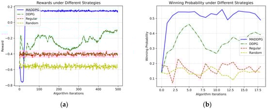A comparison of the different strategies in the four-radar scenario. (a) Reward in the four-radar scenario. (b) Winning probability in the four-radar scenario.