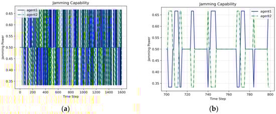 Jamming capability allocated to the two radars. (a) During the whole game. (b) In typical time steps.