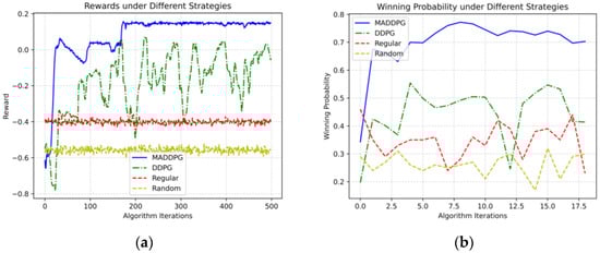 It can be seen in Figure 5a that, due to the increased environmental instability brought by the change in agent strategy, it is more difficult for the DDPG algorithm to learn the stable strategy; the reward value fluctuates in a large range and the highest point is smaller than the MADDPG algorithm. Similarly, the reward of the MADDPG algorithm also exceeds that of the fixed strategy and random strategy, and it is convergent. The simulation also carries out 1000 rounds of games on the model trained at different stages to eliminate randomness. As can be seen in Figure 5b, the strategy trained with the MADDPG algorithm can bring a higher average winning probability, which means that the missile-borne radar learns the collaborative detection method and completes the detection task better. The average winning probability of the other three strategies is lower than the MADDPG. The winning probability of the MADDPG algorithm can reach 70% in the confrontation, which is 20% higher than the DDPG algorithm, demonstrating the effectiveness of collaboration optimization. The winning probability of the regular strategy and random strategy is very low, and we cannot see any trend of better performance. When the radars win the game at a percentage of less than 30%, the task can hardly be conducted.