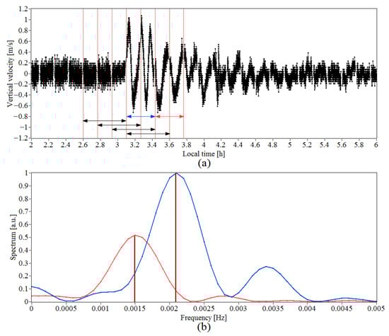 Time series (a) and power spectra of the vertical component of wind velocity at time intervals of 03:06–03:26 LT (blue arrow, blue curve) and 03:26–03:46 LT (red arrow, red curve) (b) at a height of 405 m. Black arrows in (a) show time intervals for which the spectra in Figure 4 calculated. Measurements were taken on6 July 2021.