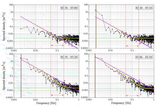 Spectra of the vertical component of the wind velocity vector at a height of 297 m calculated for the measurement intervals shown by the black arrows in Figure 3a (black curves). Green dashed lines show the noise component of the spectrum. Red arrows show the interval, within which the turbulent energy dissipation rate is determined by the our method described in [46]. Yellow curves are for the theoretical spectra calculated by us using Equation (14) in [46] and the experimental values of . The purple lines are for the −5/3 Kolmogorov–Obukhov spectra calculated by us using Equation (18) in [46]. The brown vertical lines show the frequencies of IGW-induced quasi-harmonic oscillations of the vertical velocity. Measurements were taken on 6 July 2021.