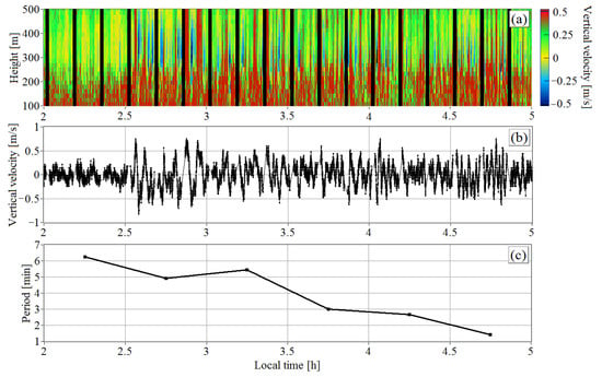 Height–time distribution (a), time series at a height of 351 m (b), and period of quasi-harmonic oscillations of the vertical velocity as a function of time (c) obtained from lidar measurements on 28 May 2022.