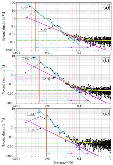 To characterize the spectra in the frequency range from to 0.05 Hz, we assume that the spectra of the vertical velocity averaged over an ensemble of realizations are characterized by power-law dependence , where is the frequency-independent coefficient and is the exponent. Then, through the least-square fitting of the linear dependence on to within this interval, we find and and approximate the experimental spectra by the power-law frequency dependence. In Figure 8, the obtained frequency functions are shown by blue lines with an indication of the exponent: = −3.2 (Figure 8a), = −2.6 (Figure 8b), and = −3.1 (Figure 8c). These estimates of differ significantly from −5/3 and are relatively close to the Lumley–Shur theoretical value = −3 and the −3 frequency dependence in the low-frequency range of the turbulent spectra in the SBL [43].