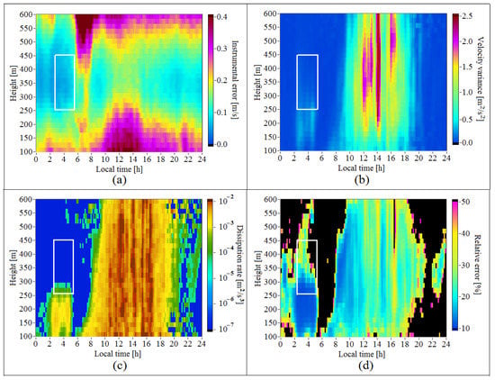 Height–time distributions of the instrumental error of estimation of the radial velocity (a), the variance of the vertical component of the wind velocity vector (b), TKE dissipation rate (c), and relative error of estimation of the dissipation rate (d). The white rectangle bounds the domain of IGW observation. Measurements were taken on 28 May 2022.