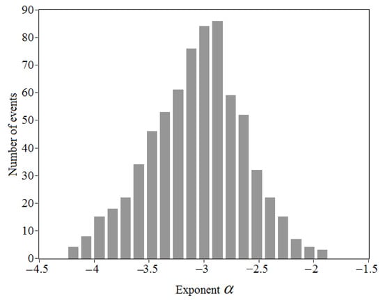 For each spectrum, the exponent was calculated assuming the power-law dependence on frequency in the low-frequency region. When determining from the selected spectra , we set the upper boundary of the frequency range, within which was estimated, depending on the level of the noise component of the spectrum (not lower than 0.02 Hz and not higher than 0.06 Hz). The lower boundary of the frequency range was taken to be not lower than the frequency of IGW-induced oscillations of the vertical velocity . Figure 13 shows the histogram of all the obtained estimates of . It follows from the data in Figure 13 that the average value of the exponent is = −3, while the standard deviation of the estimates is 0.44. The probability that the estimate of the exponent takes a value from −3.5 to −2.5 is 80%. The obtained estimate of the average exponent confirms “−3” low frequency slope caused by IGWs in turbulent spectra, which were observed in the 300 m lower layer of the SBL [43].