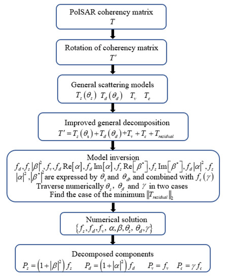 A representative general polarimetric model-based decomposition framework was proposed by Chen et al., which implements a simultaneous full-parameter inversion by using complete polarimetric information and solves several limitations in previous decomposition methods. However, there are still shortcomings in Chen’s work. Firstly, only the real part of the parameter in the generalized surface scattering model is considered. Secondly, inappropriate initial input values may lead to local optima in the nonlinear least squares optimization algorithm. Thirdly, the volume scattering component is underestimated in the volume scattering-dominated scene, but overestimated in buildings with large orientation (LOB) areas. Finally, nonlinear optimization is time-consuming computationally. To overcome those issues, an improved generalized polarimetric model-based decomposition method is proposed in this paper. The imaginary part of the parameter is incorporated into the decomposition framework of the proposed method. Ingeniously utilizing the internal relationship in the generic equations composed of coherent matrix elements, the model parameters can be inversed by simplifying the nonlinear equations to linear equations. Therefore, compared with Chen’s method, the proposed method does not rely on the initial input values, and improves the computational efficiency. In addition, a hierarchical decomposition scheme is presented to solve the problem of underestimation or overestimation of volume scattering component mentioned above. The performance and advantages of this method are evaluated with L-band and C-band polarimetric synthetic aperture radar (PolSAR) data sets. Comparison studies are carried out with other model-based decomposition methods, demonstrating that the proposed method can further improve decomposition performance, especially in LOB areas.