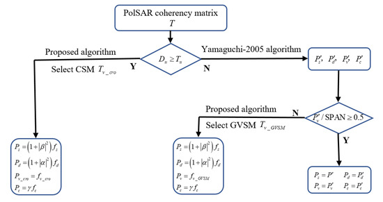 In the hierarchical decomposition scheme, according to the threshold , the CSM is used to consider the cross-scattering of oriented buildings, thus making it more flexible and adaptive for urban areas, while the GVSM is applicable to nonurban areas. In addition, we use a branch condition to solve the underestimation of the volume scattering in the volume scattering-dominated areas, where is volume scattering power in the Yamaguchi 2005 algorithm [29]. To be specific, the Yamaguchi 2005 algorithm is first applied to nonurban areas. When [45], we use the decomposition results of the Yamaguchi 2005 algorithm; otherwise we use the decomposition results of the algorithm proposed in this paper. By doing so, the decomposition results of the proposed method are close to the actual scene. The detailed flowchart of the hierarchical decomposition scheme is shown in Figure 2.