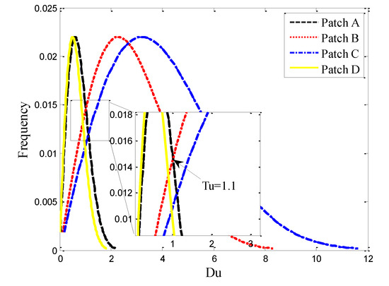 To quantitatively evaluate the performance of different decomposition methods and ascertain the discriminating threshold, four types of land cover classes are considered in the image (the red box area in Figure 5a): shrub/scrub areas (patch A), building with small orientation (SOB) areas (patch B), LOB areas (patch C) and ocean areas (patch D). The corresponding feature histograms are given in Figure 6. It can be observed that there is a significant distinction in the criteria area descriptors between urban areas (patch B and patch C) and natural areas (patch A and patch D). This makes it easy to separate the building areas from other land cover areas. According to the literature [41] and Figure 6, the discriminating threshold can be set as 1.1 for the case of the AIRSAR data. After determining the threshold value, the corresponding normalized scattering power statistics are shown in Table 1.