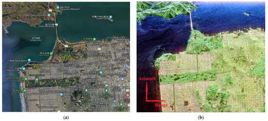 Radarsat-2 satellite data with C band. (a) Optical image. (b) Pauli RGB image.
