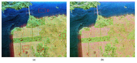In order to evaluate the performance of the proposed method, the National Land Cover Database 2011 (NLCD 2011) is used for the ground reference data, as also shown in Figure 4 [41,46]. The decomposition results from the four methods are shown in Figure 5, where the red channel describes double-bounce and cross-scattering (urban scattering mechanism), the green channel describes volume scattering (shrub areas), and the blue channel describes surface scattering (ocean areas).