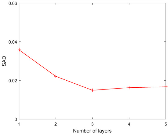 SAD results of proposed -RDNMF with different settings of the number of layers.