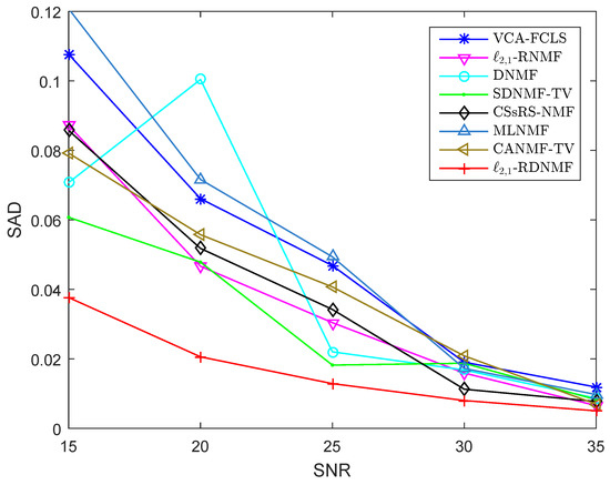 To verify the proposed method’s effectiveness, synthetic HSI data with various noise intensities are utilized to assess the algorithms’ performance. The value of is specified as 15, 20, 25, 30, or 35 in order to simulate various noise intensities; is set to 5 in the experiment. Figure 4 and Figure 5 show the SAD and RMSE results of algorithms when the noise level varies. When , the algorithms all perform well and are at a comparable level. When the value of decreases, all five methods’ performance degrades as anticipated. However, it can be seen that the proposed -RDNMF apparently obtains lower values of SAD and RMSE, which validates the robustness of -RDNMF to various noise levels.