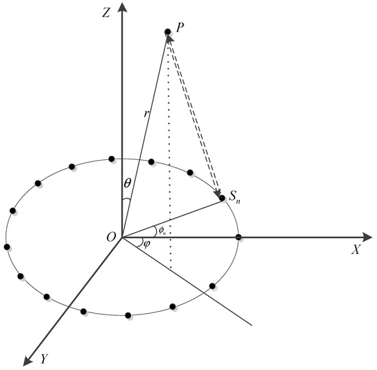 Assume is an arbitrary scatterer in space, where is the range between point and the coordinate origin , and and represent the elevation and azimuth of , respectively. Based on the geometry, as shown in Figure 1, the echo of the scatterer received by the UCA can be expressed as [9]: