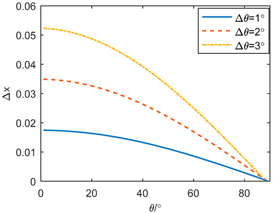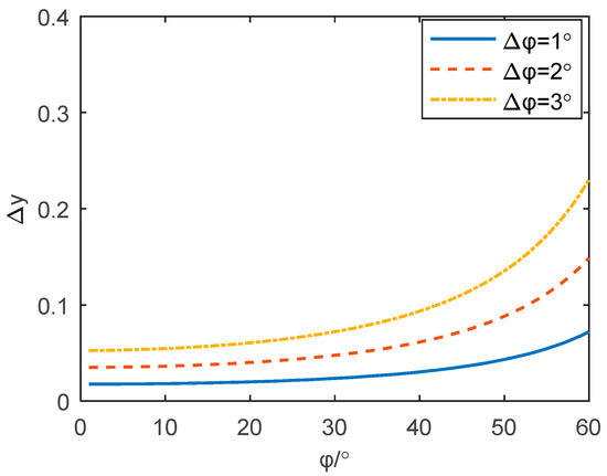 For the first kind of scatterers, the elevation is solved from Equation (18) by utilizing the properties of the Bessel function with fractional order. By comparing Equation (18) with Equation (28), the elevation of the first kind of scatterer is also obtained by an arcsine function, and thus it must satisfy Equation (31). However, the azimuth still needs to be solved by Equation (27), which is obtained by an arctan function. Assuming the azimuth resolution is , the calculation error of elevation will satisfy