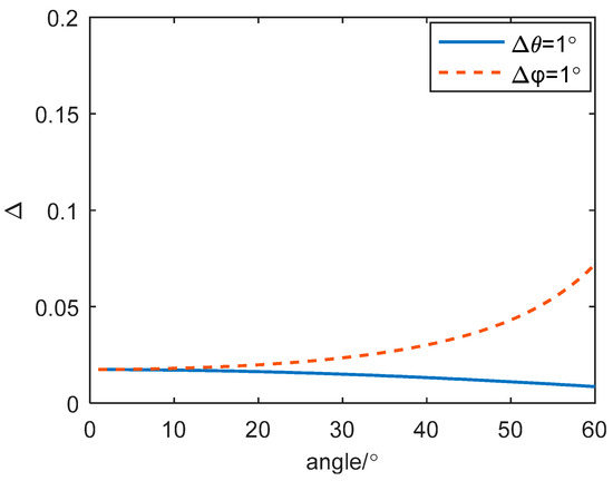 The requirement of and are compared with the same resolution, which is shown in Figure 6, and is defined as a calculation error of the azimuth or elevation. It can be found that the requirement of is significantly higher than the requirement of .