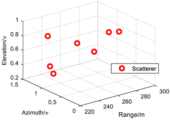 In this section, the performance of the proposed method is validated by simulations. The UCA comprises 50 elements with a radius of 0.1 m, and the center of the UCA is set at the origin. The integer OAM mode during this is , and the fractional OAM modes are and , respectively. The LFM signal is set as a transmitting signal; the center of frequency is 10 GHz; and the bandwidth of the signal is 100 MHz. There are seven independent scatterers on the target, and the coordinates of these scatterers are listed in Table 1 and shown in Figure 7.