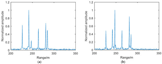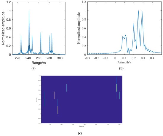 where and is the range between the reference point and transmitters. Due to the transmitting signal being set as the reference signal, therefore, and . From the properties of the sinc function, the information of the target range can be obtained by the operation with de-chirping and FFT successively. If the scatterers are in different range bins, each peak can represent only one scatterer. According to Equations (14) and (15), the amplitude of each scatterer on a one-dimensional range profile with order can be expressed as