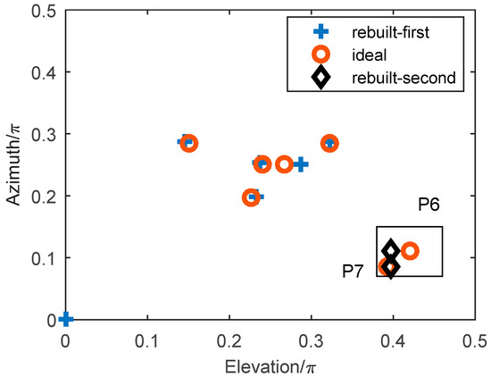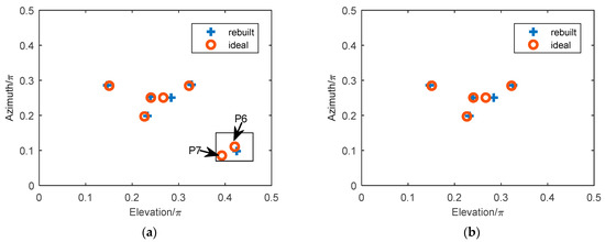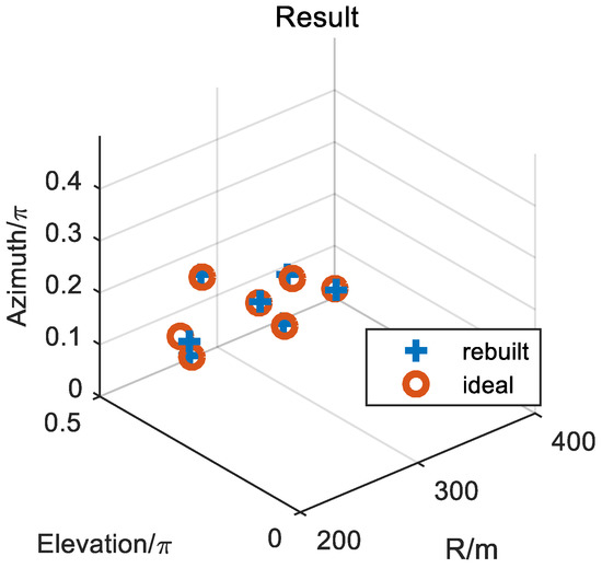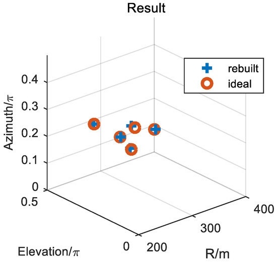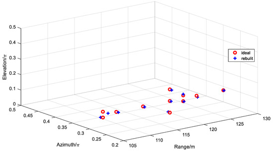 The elevation and azimuth of the first kind of scatterers can be obtained from Equations (18) and (26). In order to improve the reconstruction accuracy and reduce the effect of noise, multi-pulses are used to obtain the average of the amplitude of range imaging. Assume that the signal-to-noise ratio (SNR) is 5 dB, the pulse repetition frequency (PRF) is 1000, and the average amplitude of 1000-times-range imaging is used. The results of two-dimensional imaging, in terms of the elevation and azimuth, are shown in Figure 10, where the red color represents the ideal model of scatterers, and the blue color represents the rebuilt scatterers. Figure 10a shows the imaging of all the scatterers, and Figure 10b shows the imaging result of the first kind of scatterers. From the results shown in Figure 10, the imaging method for the first kind of scatterers can realize the accurate reconstruction of ~. However, for the second kind of scatterers and , only one scatterer can be rebuilt, and the solved information is also not the real coordinate of the scatterers.