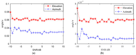 The reconstruction error of the first kind of scatterers under different SNRs. (a) The average deviation of elevation and azimuth under different SNRs. (b) The average variance of elevation and azimuth under different SNRs.