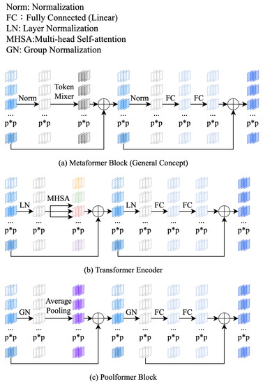 Metaformer-based networks focus on the characteristics of the transformer encoder architecture and use other operations to act as token-mixers instead of self-attention. Poolformer uses average pooling, which has no weights, as the token-mixer [25]. Compared to transformer-based networks with multi-head self-attention, Poolformer has much lower computational complexity. Another Metaformer uses multilayer perceptron (MLP) as the token-mixer and achieves acceptable results on image classification tasks [35]. Although a gap in performance between this method and the most advanced CNNs can be observed, its special architecture can significantly help future investigations into interactions in a neural network. Figure 1 displays the general concept of the Metaformer block and the architecture of the transformer encoder and poolformer block.