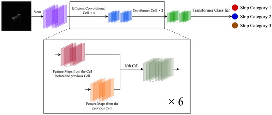 Convolutional cells and a transformer classifier are integrated together in the proposed network for SAR ship classification. The overall architecture of the SCM is shown in Figure 2 and Table 2. The SCM contains four searched convolutional cells, two proposed ConvFormer cells, and one transformer classifier. To achieve a small model size and low computational complexity, a very small number of initial channels is selected and the sizes of the feature maps are reduced many times in the SCM.