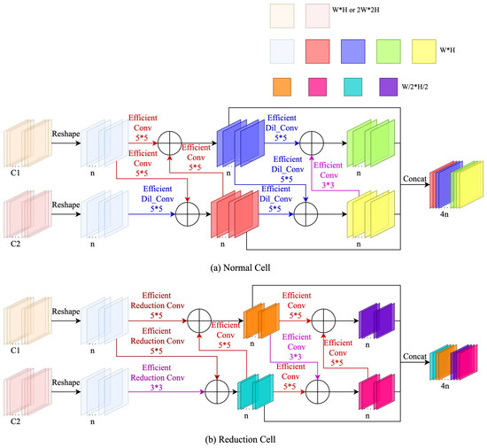Architectures of searched cells. Efficient convolutional and dilated convolutional operations do not change the shape of feature maps. Efficient reduction convolutional operations reduce the height and width of feature maps by half.