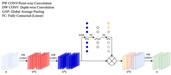 DSCONV has the advantage of low computational complexity, but low accuracy performance can be observed when a small channel number is set. Recently, research on efficient networks has shown the EfficientNet version MBCONV has strong feature extraction and generalization capability [22,24]. To achieve better performance, we replace DSCONV with the EfficientNet version MBCONV as the basic block of candidate operations. The architecture of the EfficientNet version MBCONV block is represented in Figure 5.