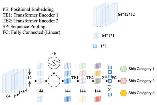 The transformer classifier of the SCM only contains two transformer encoders. Firstly, convolution shows more advantages than transformer blocks in a small-size two-dimensional dataset. Secondly, the transformer encoder suffers more from overfitting and usually has higher computational complexity [34]. Lastly, the searched convolutional cells already have strong feature extraction capability in SAR ship images, and adding a small number of self-attention-based modules can help obtain improved learning capability. We believe that the ratio of convolutional operations to transformer blocks in the SCM leads to a better trade-off between accuracy and computational complexity. The classifier used in the SCM is shown in Figure 6, including one trainable positional embedding, two staked transformer encoders, one sequence pooling, and one fully connected layer.