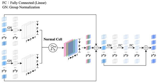 The ConvFormer Cell is designed by filling a Metaformer block. The searched efficient convolutional cell is used as the token mixer, which can combine the advantages of both NAS and Metaformer. The architecture of our proposed ConvFormer cell is shown in Figure 7. This cell adds two residual connections, two group normalization layers [44], and two fully connected layers activated by GeLu [45]. Notice that the residual connection requires that both inputs share the same shape. Hence, the token mixer in a ConvFormer cell is only a normal cell.