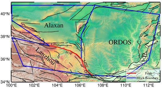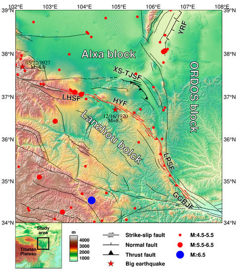 According to the previous division model of blocks [32], the northeastern margin of the Tibetan Plateau is divided into the ORDOS block, Alxa block, and Lanzhou block with the boundaries of the LHSF, HYF, LPSF, and GGBJF, and block boundaries coincide with the active faults (Figure 3).