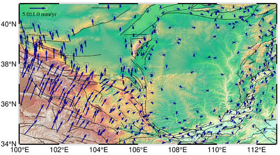 GAMIT/GLOBK software, version 10.6, was employed to estimate the daily solutions of station coordinates [29,30]. The ORDOS reference frame was defined by five stable GPS stations, and the ITRF2014 velocity field was transformed into the ORDOS reference frame. The specific strategy of the GPS data process can be found in the literature [31]. Figure 2 shows the GPS velocity field with respect to the ORDOS block regional framework.