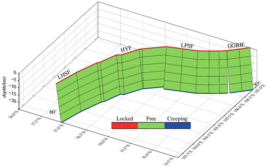 Accurate determination of the geometric model of the fault could make the model better fit the observed GPS velocity field, thus reducing the residuals of the velocity field to obtain better results. When modeling the fault surface (Figure 4), the dip angle of the LHSF and HYF was set to 60° with an SSW tendency, and the dip angle of the LPSF and GGBJF was set to 45° with an SW tendency. The fault was set to be completely locked ( = 1) at 0.1 km and free-slipped ( = 0) below 25 km. The fault node parameterization type was set to a one-dimensional depth profile type in which the node value is a function of depth [33], which was expounded in detail in Section 6.2. In the inversion, two surface nodes were set along the strike, and six nodes were set along the depth direction for the LHSF. The HYF had eight surface nodes and six depth nodes, the LPSF had six surface nodes and six depth nodes, and the GGBJF had three surface nodes and six depth nodes. The fault surface node meshing was based on the actual surface traces of the active fault. Additionally, by setting surface and depth nodes along the strike and dip of the fault, the fault is constructed into a fault surface composed of many small grids. The locking fraction at each small grid is iteratively calculated using an inversion algorithm, thereby obtaining a continuous distribution of the locking fraction of the entire fault surface. The number of nodes on the fault surface and the depth are the optimal values obtained through extensive trial calculations. All these settings are aimed at obtaining more accurate crustal deformation characteristics.