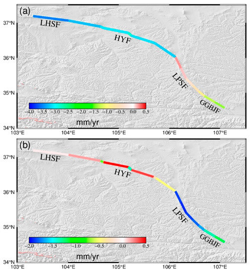 Fault slip rates. (a) is the strike-slip component; the positive value represents the right-lateral strike-slip and the negative value represents the left-lateral strike-slip; (b) is the dip-slip component; the positive value represents extension and the negative value represents contraction.