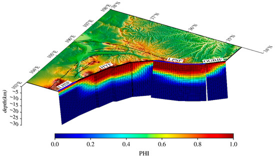 The initial locking depths of the faults can also be calculated by a grid search. For the LHSF and HYF, the initial locking depth is 15 km by searching in the range of 10–20 km; for the LPSF and GGBJF, the initial locking depth is 15 km by searching in the range of 15–25 km. With other parameters unchanged, the model performed inversion at intervals of 5 km at locking depths between 15 km and 40 km. Comparing the of the results, it was concluded that 25 km was the optimal choice for this model. In addition, according to the catalog of earthquakes above M3-magnitude in mainland China and its surrounding areas [50] and the study on the precise location of earthquakes [51], the focal depth of most earthquakes on the northeastern margin of the Tibetan Plateau is less than 25 km. Therefore, the final locking depth was set as 25 km.