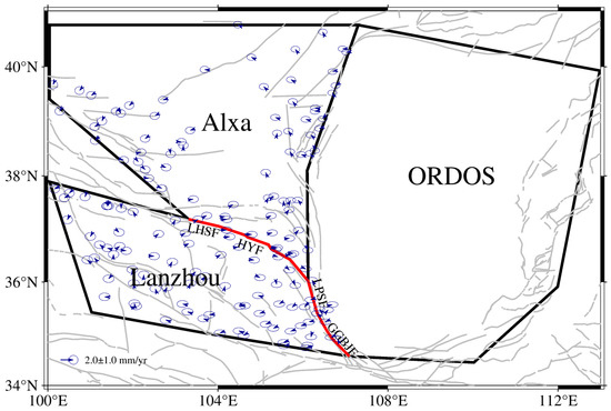 The LHSF is the boundary zone between the Alxa block and the Lanzhou block, and it intersects with the west section of the HYF; the GGBJF is the boundary zone between the ORDOS block and the Lanzhou block, which is an extensional fault of the LPSF and intersects the south section of it. Both the LHSF and GGBJF are highly active faults and have frequent historical earthquakes (Figure 1) and have a strong influence on the near-field observations of the Haiyuan–Liupanshan fault zone. In order to improve the accuracy of model inversion and better fit the GPS observations, the LHSF and GGBJF were added to the model, and the elastic deformation caused by their locking was considered. The LHSF and HYF are the boundary zone between the Alxa block and the Lanzhou block, and the LPSF and GGBJF are the boundary zone between the ORDOS block and the Lanzhou block.