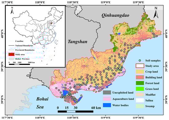 The study area is located in the northeast of Hebei, China (38.92°–40.32°N, 118.14°–119.85°E) (Figure 1) and covers an approximate area of 7387 km2. It is a typical plateau continental climate, with a mean annual temperature and mean annual precipitation of 12.4 °C and 1086.6 mm, respectively. The region is mainly composed of plains, with mountains in the north and elevations ranging from 0 to 1091 m, with an average elevation of 43 m. The eastern and southern parts of the study area are adjacent to the sea, located in a transitional zone between land and sea. It possesses abundant wetland resources and is an ecosystem with distinct environmental features. STN content in this area is influenced by both terrestrial and marine factors. Additionally, this area is an important region within the Bohai economic circle with rapid economic development. The land use in this region is complex and changes rapidly, and there is a large uncertainty in STN content.