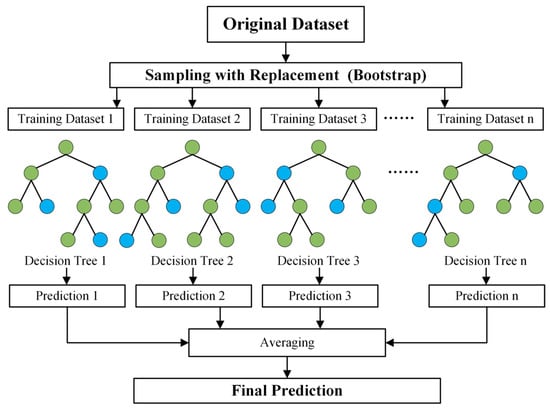 RF is a commonly used machine learning algorithm. It is a model composed of a random collection of independently trained decision trees [38]. The training data for each decision tree is obtained by random sampling with replacement from the original dataset, and the final model’s prediction is the average of all decision tree results (Figure 2). The advantages of the RF method have the ability to (1) handle nonlinear relationships between multiple predictors, (2) identify and correct overfitting problems, thereby improving prediction accuracy, (3) handle high-dimensional data and automatically deal with missing and outlier values, and (4) output the importance of each predictor to the model’s prediction, which further helps understand the influencing factors of the soil properties [39].