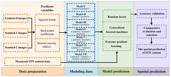 The primary objective of this study was to map the STN content in the coastal wetlands of northeast Hebei, China, using Landsat-8, Sentinel-1, and Sentinel-2 images, and to evaluate the effectiveness of different remote sensing sensors. Landsat-8, Sentinel-1, and Sentinel-2 images were obtained for generating predictors (multispectral remote sensing bands, remote sensing indices, and backscatter coefficients). We utilized RF, GBM, and XGBoost methods to compare the prediction accuracy of different combinations of these predictor variables in predicting STN content. Furthermore, we assessed the potential of different remote sensing sensors, such as Landsat-8, Sentinel-1, Sentinel-2, and different combinations of sensors, for mapping STN content. We then investigated the importance of the generated predictor variables. Finally, we plotted the spatial distribution of STN content in the study area based on the optimal models. This study helps to explore the most suitable remote sensing imagery and machine learning methods for predicting STN content in coastal areas. The map of STN content provides a better understanding of land resources, helps assess land suitability for different uses, and aids in land planning and decision-making.