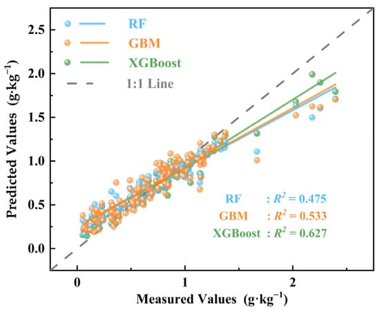 - The XGBoost method had higher accuracy than the RF and GBM methods. The optimal model was built using the XGBoost method, with an R2 of 0.627, RMSE of 0.127 g·kg−1, and an MAE of 0.092 g·kg−1;