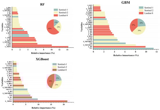 - Optical imagery is more helpful than SAR imagery in predicting STN content. In the models established by the RF and XGBoost methods, Landsat-8 had the highest relative importance (63% and 44%, respectively), followed by Sentinel-2 (24% and 33%, respectively). In the model established by the GBM method, the importance of Landsat-8 and Sentinel-2 was similar but higher than that of Sentinel-1;
