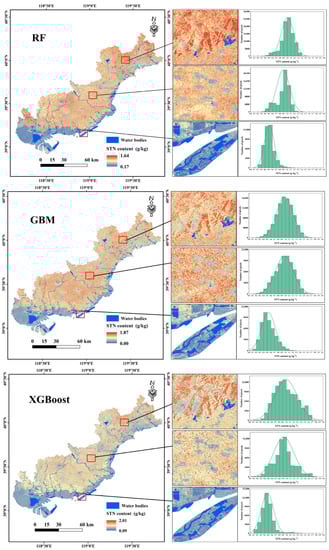 Spatial distribution map of STN content obtained based on the RF, GBM, and XGBoost methods (Model VII: Landsat-8 + Sentinel-1 + Sentinel-2 predictors).