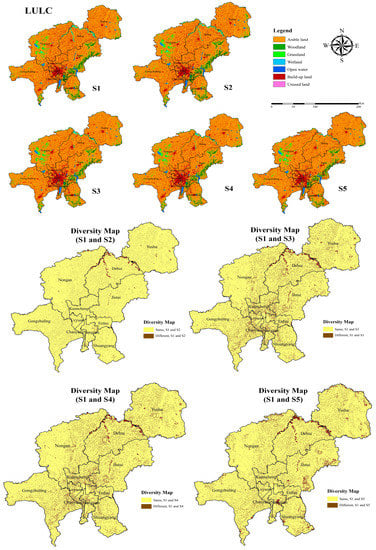 - Liu, X.; Liang, X.; Li, X.; Xu, X.; Ou, J.; Chen, Y.; Li, S.; Wang, S.; Pei, F. A future land use simulation model (FLUS) for simulating multiple land use scenarios by coupling human and natural effects. Landsc. Urban Plan. 2017, 168, 94–116. [Google Scholar] [CrossRef]