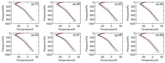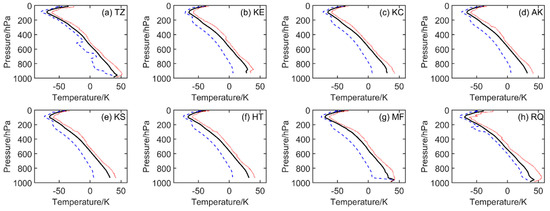 Monthly averaged atmospheric temperature profiles from GIIRS/FY-4A for the eight stations in TD in July 2021. The black, blue and red lines indicate the mean, minimum and maximum, respectively. The station name of each subplot is given in the upper-right corner of each subplot.
