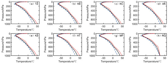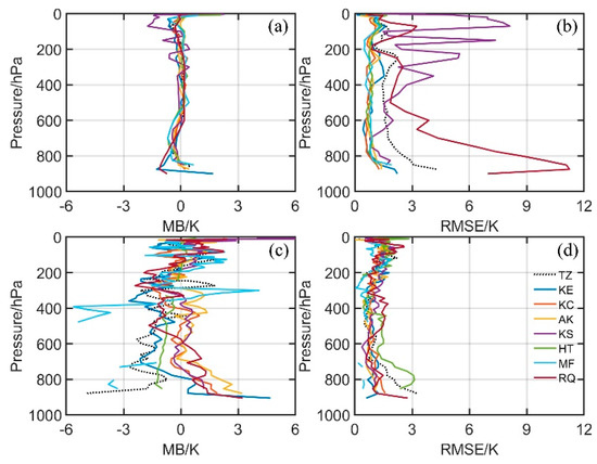 The absolute values of mean biases of the ERA5 ATPs (Figure 7a) are generally smaller than 2 K for all the eight stations. The maximum temperature appears near the ground. Most of the mean bias values are less than 1 K in the middle layers between 800 hPa and 200 hPa. The monthly averaged RMSE of the ERA5 ATPs (Figure 7b) are generally within 3 K, except for that in the upper layers over KS station and that in the lower layers over RQ station. The maximum RMSE is about 11 K near land surface at RQ station, and it is 8 K at around 100 hPa at KS station.