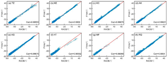 Relative to the correlation coefficients between the ERA5 ATPs and RAOB ATPs (Figure 8), the correlation coefficients between the GIIRS/FY-4A and RAOB ATPs (Figure 9) are slightly smaller, except for that at RQ and KS stations. The correlation coefficient between the ERA5 ATPs and RAOB ATPs at RQ station is 0.992 (Figure 8h), but the correlation coefficient value increases to 0.9954 between the GIIRS/FY-4A ATPs and RAOB ATPs (Figure 9h). This is because ERA5 severely underestimates the temperature in the lower troposphere at RQ station, as shown in Figure 7a,b. The oasis area around RQ station is small, surrounded by a large desert. Such a situation has been better considered in the retrieval process of the GIIRS/FY-4A ATPs than in the construction of ERA5 reanalysis data. Meanwhile, ERA5 also underestimates the air temperature in the upper troposphere at KS station, which is indicated by the purple lines in Figure 7a,b. In addition, the largest increment of correlation coefficients from GIIRS/FY-4A to ERA5 appears at HT and MF stations, which means that the quality of the ERA5 ATPs is obviously better than the GIIRS/FY-4A ATPs at these two stations, especially in the lower levels.