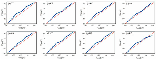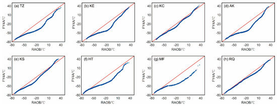In order to judge whether the ERA5 ATPs and GIIRS/FY-4A ATPs follow the same pattern of probability distribution with the RAOB ATPs, the Quantile-Quantile (QQ) plots of them over the eight stations are provided below, with Figure 10 for the QQ plot between the ERA5 ATPs and RAOB ATPs, and Figure 11 for the GIIRS/FY-4A and RAOB ATPs. The air temperature from ERA5 is generally higher than the RAOB temperature, while the FY4A-retrieved temperatures are generally lower than RAOB temperature. Meanwhile, relative to the FY4A ATPs, the distribution of the ERA5 ATPs is more similar to that of RAOB ATPs. The largest discrepancy between the GIIRS/FY-4A and RAOB ATPs appears at MF station, while their smallest similarity is at RQ station.